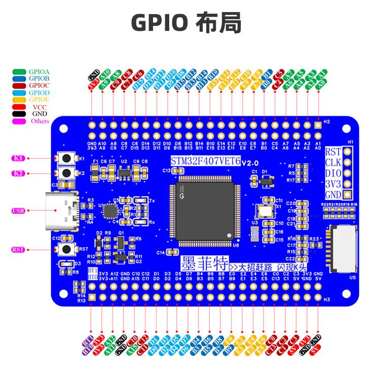 我们开发板所使用的 STM32F407VET6 芯片共有 100 个引脚,其中有 82 个引脚是 GPIO 端口,这些 IO 引脚分为五组,分别是 GPIOA~GPIOE,每组包含 16 个引脚。这些引脚输入模式下通常能够承受的电压范围是 0 到 3.3V,少数可以容忍 5V;而输出模式最大只能输出 3.3V。如图我们所使用的开发板引出了 75 个可用 IO 引脚。