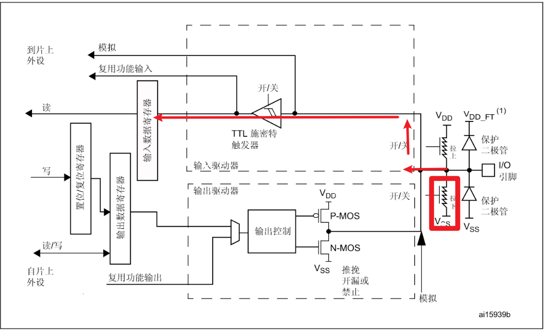 - 引脚内部连接一个下拉电阻到 GND,适用于外部开关或按键接 Vcc 的情况。