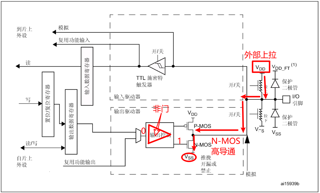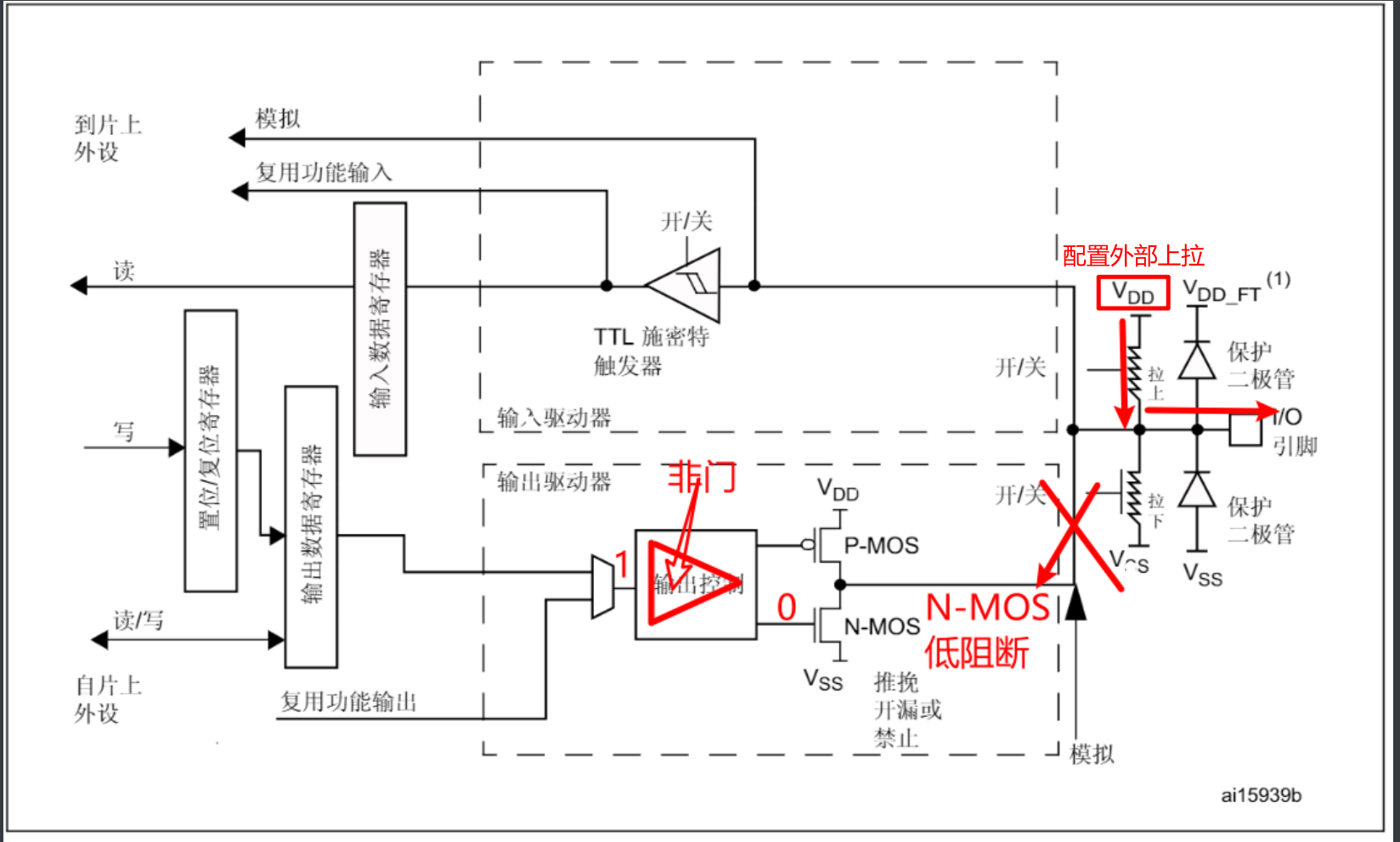 - 引脚只能输出低电平(连接到 GND),高电平由外部上拉电阻决定。这种模式常用于 I2C 等通信协议。