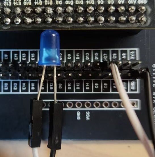 使用外接 LED 灯进行实验演示,使用 GPIOC9 引脚,LED 灯引脚长正短负,我们使用母对母杜邦线将正极与开发板的 C9 连接,负极与 GND 连接。