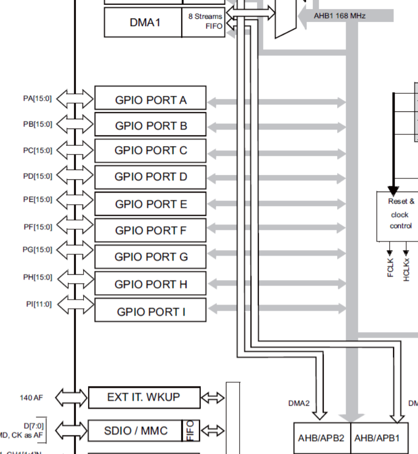 - 查阅芯片手册可知,所有 GPIO 外设的时钟都是由 AHB1 总线提供。